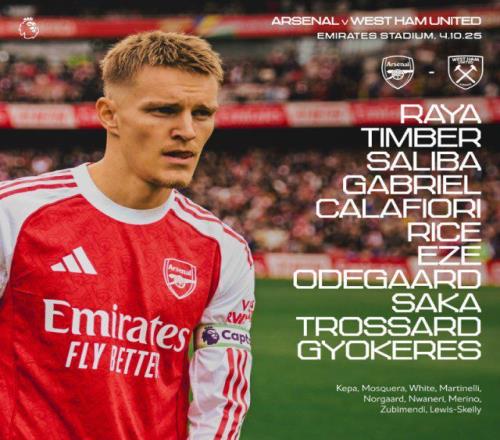 本周六英超第7轮,阿森纳主场迎战西汉姆。赛前枪手公布了首发阵容,厄德高首发,埃泽也出现在了先发11人当中。具体布阵如下:拉亚/廷伯、萨利巴、加布里埃尔、卡拉菲奥里/厄德高、赖斯、埃泽/萨卡、哲凯赖什、特罗萨尔。