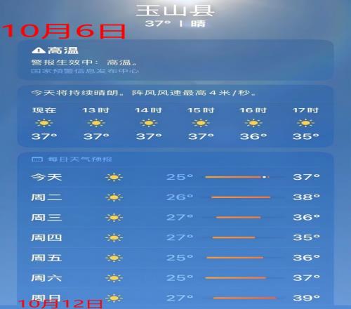 玉山县可能在本周末达到39度。