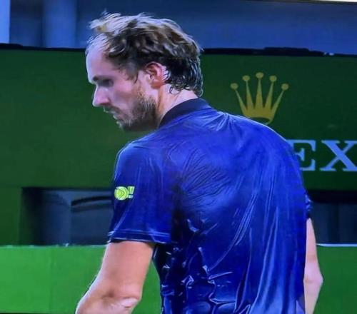 梅德韦杰夫没打多久就跟落汤鸡一样。