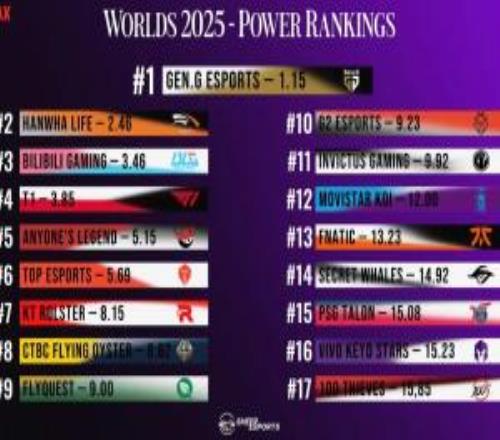 电竞体育10月13报道 外媒sheep esports发布了S15全球总决赛战队实力排名,GEN、HLE、BLG、T1前四,TES第六、iG第十一
