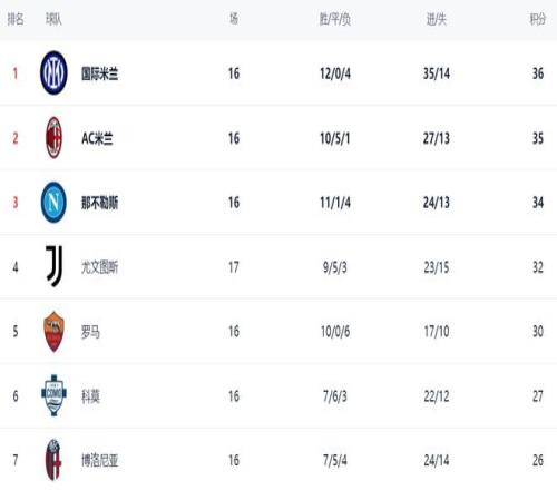 在积分榜上,国际米兰以36分排名榜首。第2名的是AC米兰,拿到35分,只落后1个积分。第3名的是那不勒斯,拿到34分,紧随其后。尤文图斯以32分排名第4。前4最多只差4分,榜首之争非常乱,每轮比赛过后都有可能导致榜首发生变化。罗马以30分排名第5,在争冠集团中有点掉队。科莫以27分排第6。第7的是博洛尼亚,拿到26分。拉齐奥以24分排名第8。