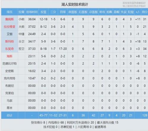 东契奇34分6板8助2断6失误、詹姆斯31分9板6助4失误。拉拉维亚成为湖人第三得分点:12投8中高效砍下21分9板3助2断,今天是拉神。艾顿4中2仅拿4分6板1断,最近的状态太低迷了。莫兰特18中7,得到16分3板11助2断。