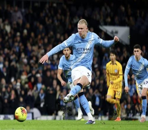 此役主场对阵布莱顿,哈兰德在上半场第41分钟主罚点球破门,帮助曼城取得1-0领先。