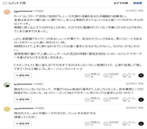 还有不少球迷感慨:当年在亚冠对中国球队踢得游刃有余,早就想到会有这么一天被中国球队看上,本来还想着他已经好不容易适应了日本联赛节奏,新赛季就能爆发,结果却走了。