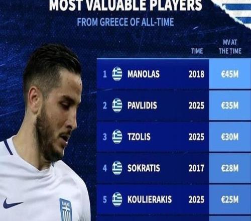 德转列希腊球员历史身价前10:马诺拉斯4500万第1,帕帕上榜